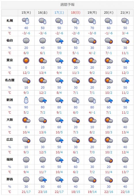 この先一週間は厳しい寒さの日が多いため、体調を崩さないようにお元気にお過ごしください。