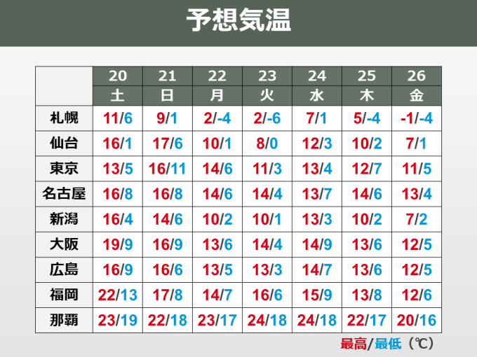 20日(土)~21日(日)は暖かい空気が流れ込み、気温は平年を上回る所が多くなるでしょう。最高気温は、西日本で20℃前後まで上がる所もある見込みで季節外れの暖かさとなり、東日本や仙台でも15℃前後まで上がる予想です。札幌でも20日(土)は11℃くらいまで気温が上がる予想で、12月とは思えない体感となるでしょう。週明けの22日(月)~23日(火)は、一時的に寒気が流れ込みこの時期らしい寒さの戻る所が多くなりますが、24日(水)~25日(木)は再び暖かい空気が流れ込み気温は平年を上回る所が多く、札幌でも6℃前後まで上がる予想です。