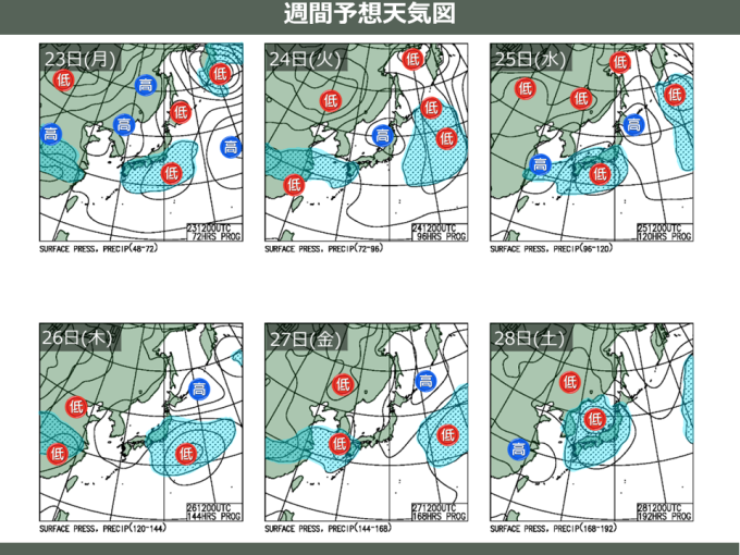 24日(火)の日本付近は高気圧に覆われ本州付近を中心に晴れますが、晴天は長続きしないでしょう。東シナ海から前線が延び、九州から雨が降りだす見込みです。25日(水)は、日本の南岸を低気圧が東へ進むため、西日本や東日本は雲に覆われるでしょう。西日本の広範囲や東日本の太平洋側を中心に雨が降る見込みです。低気圧や前線から離れた北日本は、北海道や東北北部を中心におおむね晴れるでしょう。26日(木)は、西日本や北陸の天気は回復しますが、関東や東海は雲が残り、雨の降る所がある見込みです。北日本は、引き続き高気圧の圏内で北海道を中心に晴れる所が多いでしょう。27日(金)は、高気圧に緩やかに覆われ、北海道から東海にかけては雲が多いながらも日が差す所がありますが、東シナ海から再び前線を伴った低気圧が近付く見込みです。九州から雨が降りだし、28日(土)には、九州から東北南部にかけて雨が降る見込みです。この先1週間の天気は、太平洋側を中心に短い期間に晴れと雨を繰り返すでしょう。