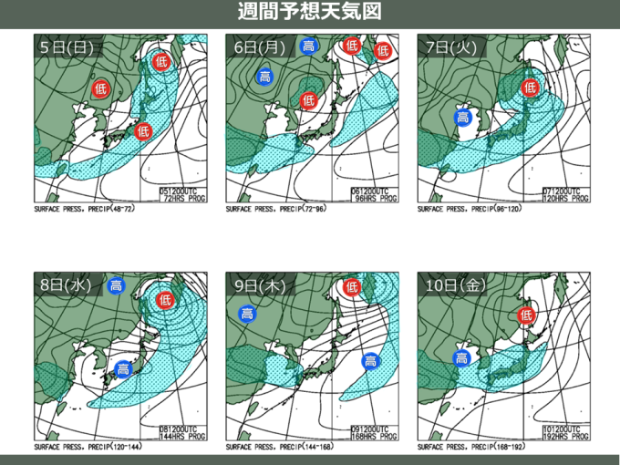 週明けの6日(月)は、次の低気圧や前線が近付くため全国的に雲が多く、九州では雨の降りだす所がある見込みです。雨の範囲は7日(火)には東日本まで広がり、西日本や沖縄・奄美では大雨となる恐れもあります。北日本も発達する低気圧の影響で大荒れとなる恐れがあるため、最新の気象情報を確認してください。