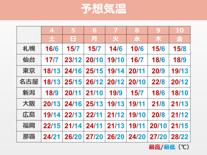 気温は平年並みか高い日が多いでしょう。5日(日)~6日(月)の最高気温は西日本や東日本で25℃以上の夏日になる所もあり、暑く感じられる見込みです。札幌でも15℃くらいまで気温が上がる予想です。7日(火)以降の気温は下がりますが、それでも平年並みかやや高く西日本や東日本では日中は20℃前後まで上がる所が多いでしょう。また、朝晩と日中の寒暖差が大きい日もある見込みです。急な暑さ、週の中や一日の中での気温差で体調を崩さないようにお過ごしください。