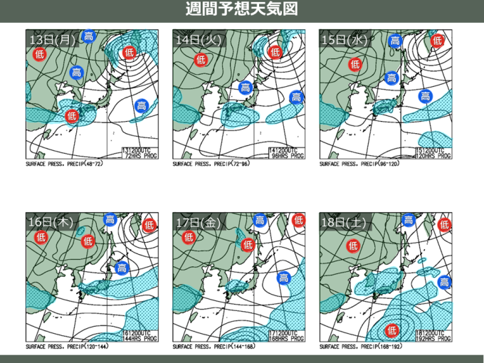13日(月)~14日(火)にかけて、西日本付近に前線が延び、九州と中国・四国は雨の所が多いでしょう。15日(水)は、九州や四国から関東など太平洋側を中心に雨が降る見込みです。山陰から北陸など日本海側も曇りや雨でしょう。16日(木)~17日(金)にかけては、前線や湿った空気の影響で沖縄や九州から関東にかけては雲の広がりやすい天気が続き、18日(土)は九州から近畿・北陸にかけて雨が降る見込みです。多少晴れ間のでるタイミングもありそうですから、最新の予報を確認し、貴重な日差しを洗濯やお出かけに計画的に使いましょう。また、来週末には、台風4号が北上してくる見込みです。小笠原に影響を与える可能性も否めませんので、今後の情報にご注意ください。