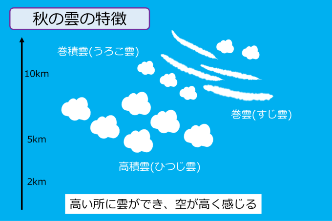 これは、空が高く澄み渡って晴れる秋には、馬も食欲を増してたくましくなるという意味です。なぜ、秋の空は「天高い」のでしょうか? この理由のひとつには、秋の雲の高さにあります。