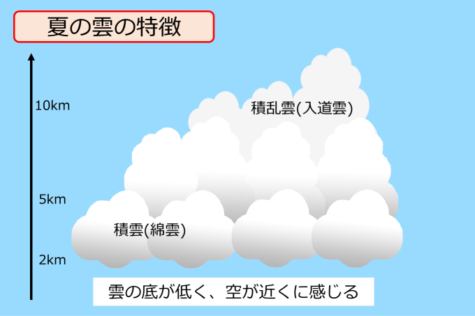 夏の空は水蒸気量が多く、白っぽくなります。夏に見られる雲は、ほとんどが積雲(綿雲)、積乱雲(入道雲)のような対流性の雲です。背の高い積乱雲(入道雲)ができることがあっても、雲が現れだす高度はさほど高くはありません。これらの雲は底が低いため、空が近くに感じます。