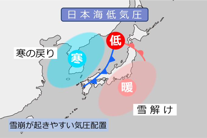 そして、「南岸低気圧」は、太平洋側に大雪や冷たい雨をもたらせることがあります。これから春先にかけては、平野部では雨になることが多いのですが、山沿いは重たく湿った雪が降ることがあります。春先とはいえ、こういったときは、表層雪崩が起こりえますので注意が必要です。