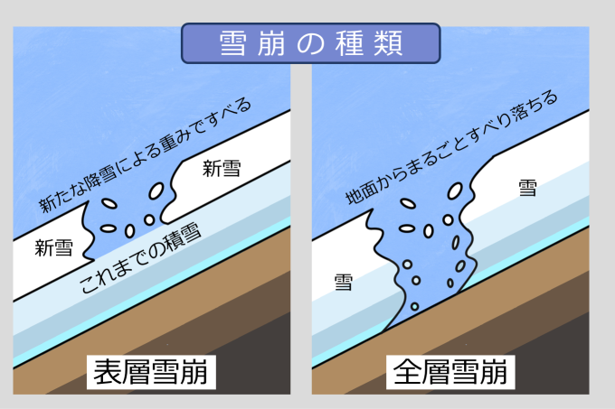雪崩には、「表層雪崩」と「全層雪崩」の2種類があります。表層雪崩は、すでに積もっている雪の上に、性質の異なる雪が積もることにより、その重みで発生します。真冬のほか、季節の変わり目の寒の戻りがあるときにおこりやすい雪崩です。一方、全層雪崩は、積もった雪が地面から丸ごと滑り落ちることにより発生します。暖かくなり気温が上昇し、雪ではなく雨が降るようになる春先に起こる雪崩です。